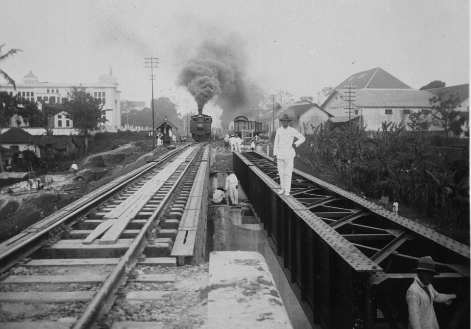 Jembatan kereta api di atas Ci Kapundung, Bandung. Jembatan sebelah kanan dipersiapkan untuk jalur kereta tambahan. Sumber: Nationaal Museum van Wereldculturen